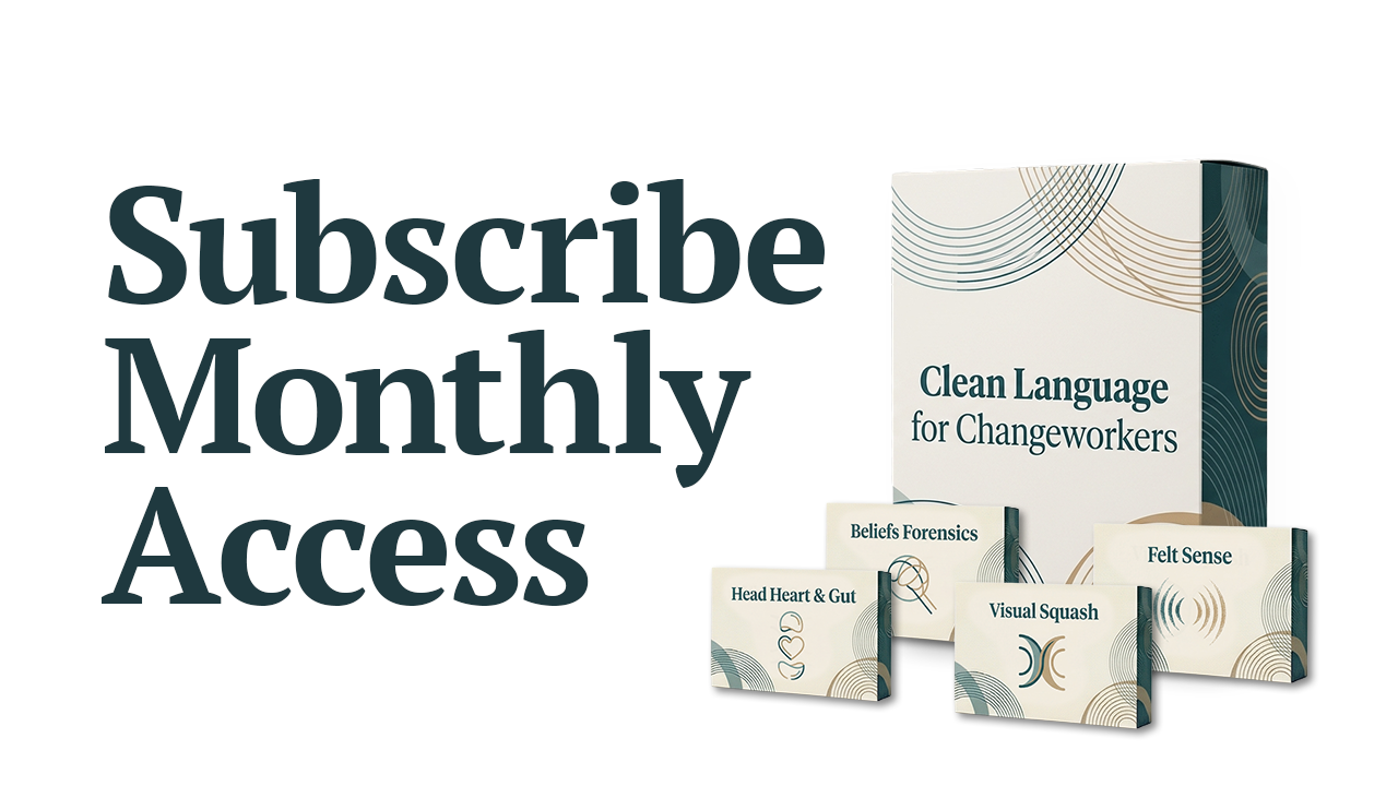 Access to all Academy trainings, including the full Clean Language module, plus — Beliefs Forensics, Head Heart & Gut, Visual Squash, Felt Sense, and much more!